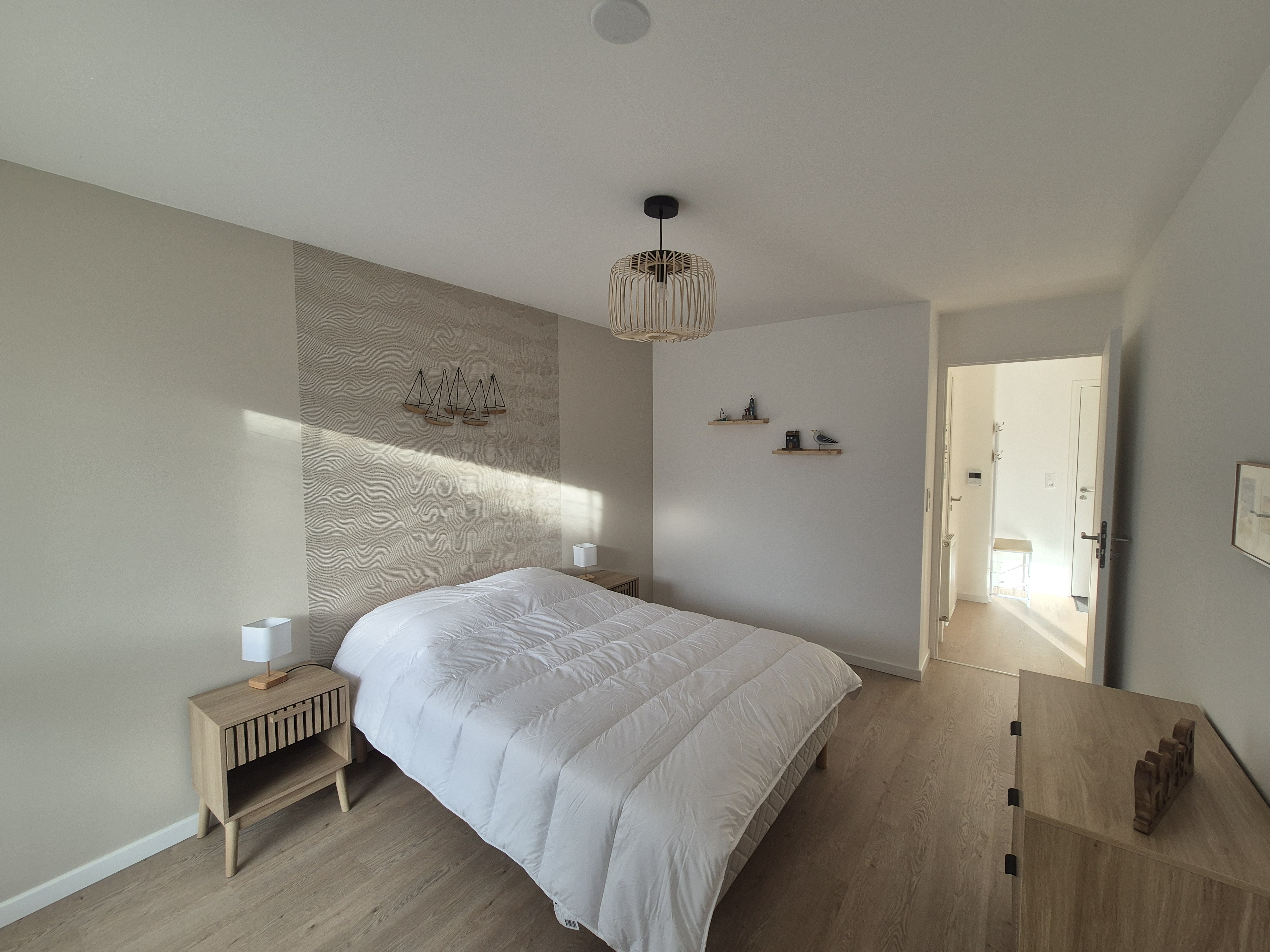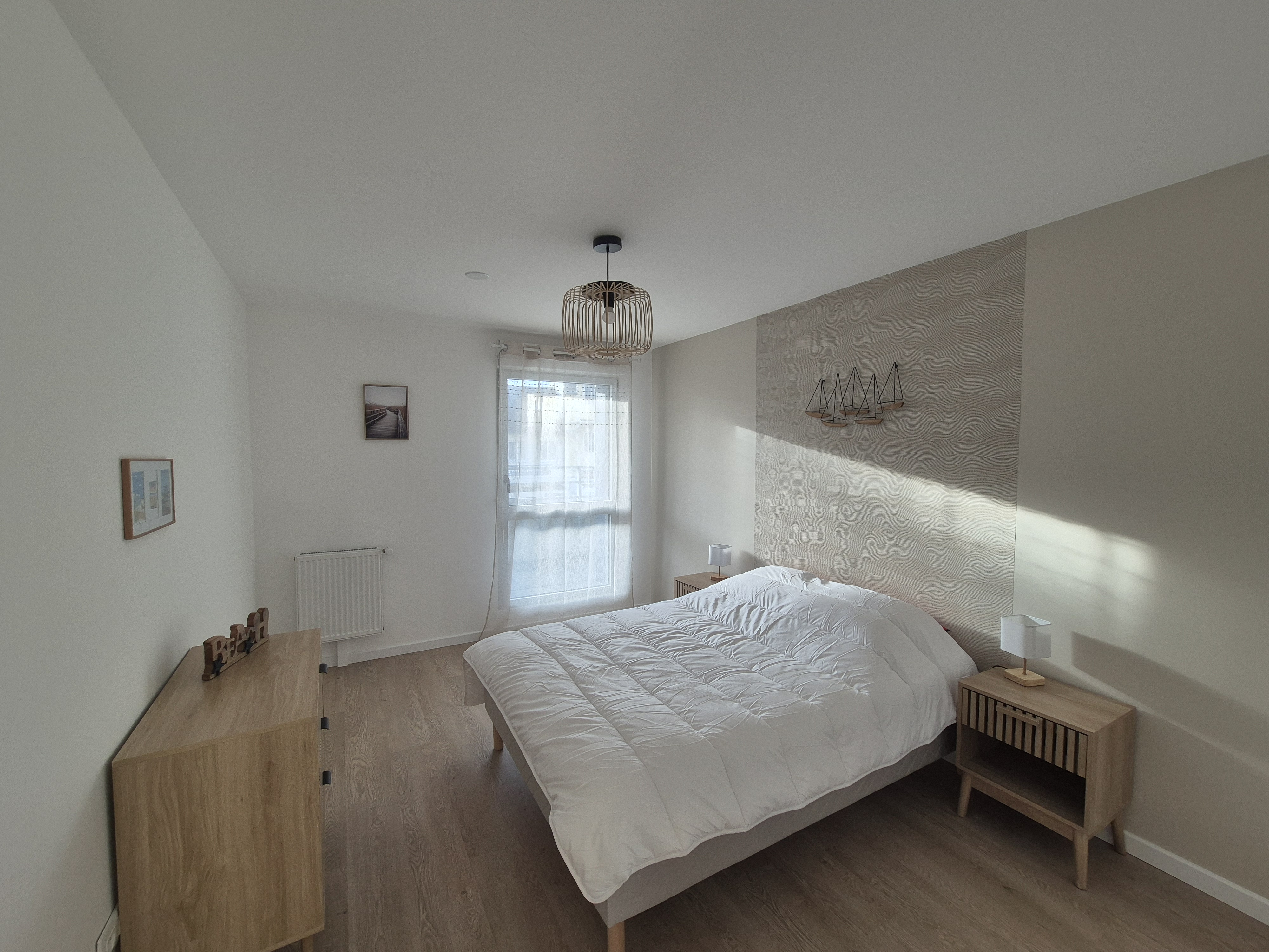 La chambre se compose d'un lit de 140 cm et le second couchage dans le salon canapé convertible avec matelas de 140 cm également, le linge de lit est a prévoir, sont mis à disposition les oreillers et les couettes.