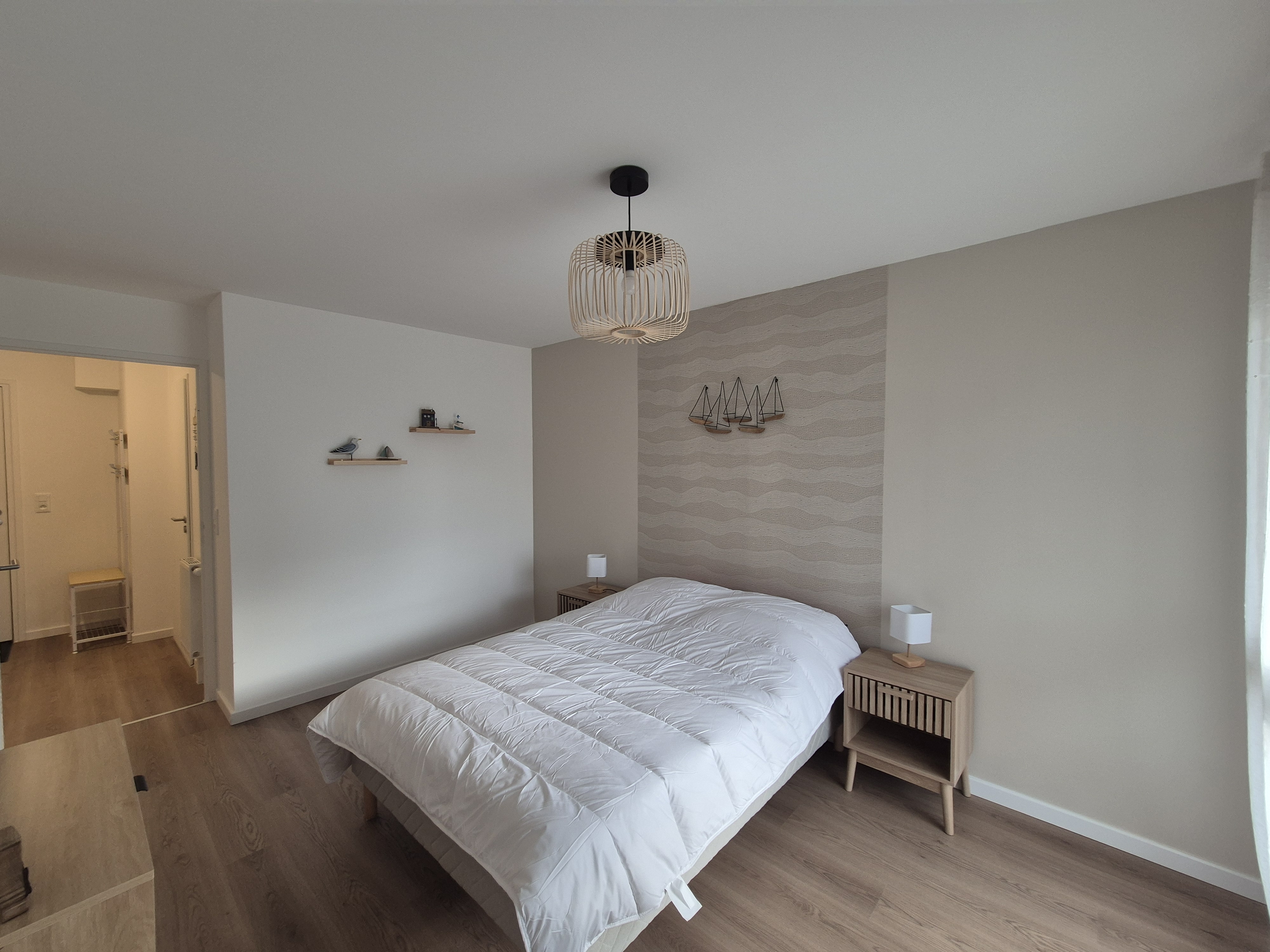 La chambre se compose d'un lit de 140cm X 190CM et le second couchage dans le salon canapé convertible avec matelas de 140cmX190CM également, le linge de lit est a prévoir sont mis à disposition les oreillers et les couettes.