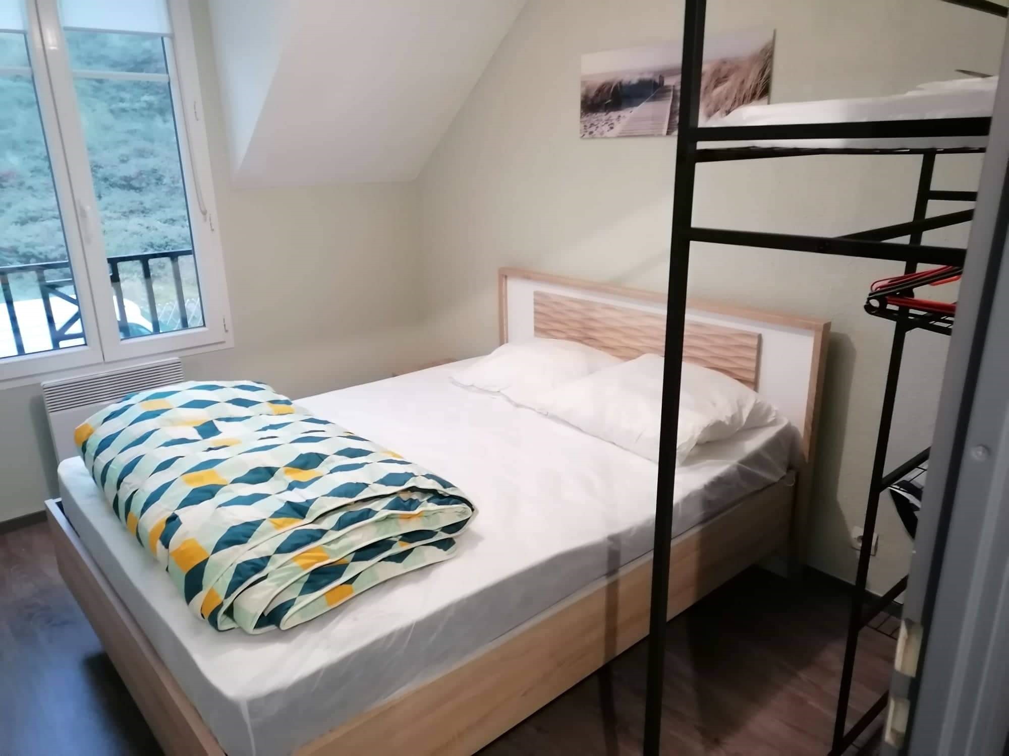A l'étage, vous trouverez 2 chambres (la 1ére avec lit double, la 2nde avec lits superposés), salle de bains (douche) et wc séparés.